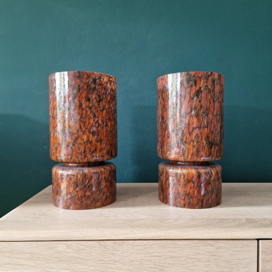 Set van 2 Vintage Peill & Putzler Tafellampen – Space Age Glas – Oranje Gemarmerd – 36 cm Hoog – Duitsland 1970s – Space Age