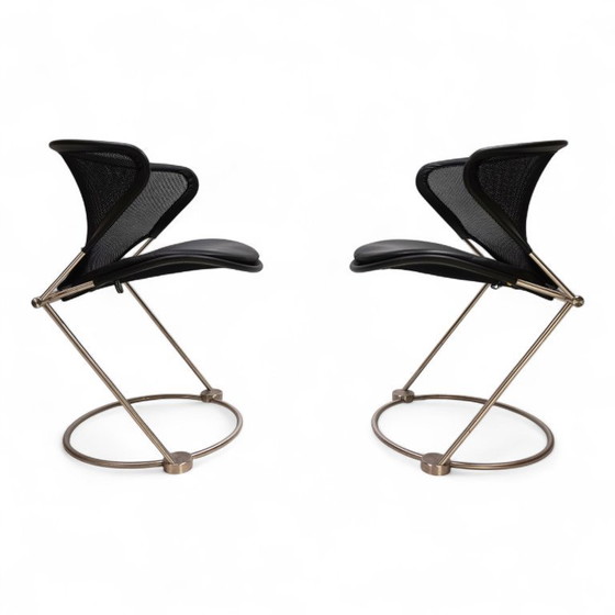 De twee Nuvola stoelen verkeren in uitstekende, zo goed als nieuwe staat. Het solide roestvrijstalen frame harmonieert perfect met het strakke zwarte polyester mesh van de zittingen en rugleuningen. Het mesh is afgewerkt met zwarte leren banden op de hoeken. Bij dit model worden ook bijpassende leren zitkussens geleverd, die desgewenst kunnen worden verwijderd. Ook deze zijn in perfecte staat. Het ontwerp en de materiaalmix zorgen voor een sublieme zitervaring. Deze stoelen zijn meer dan zomaar een meubelstuk; ze vormen een statement in elke ruimte.