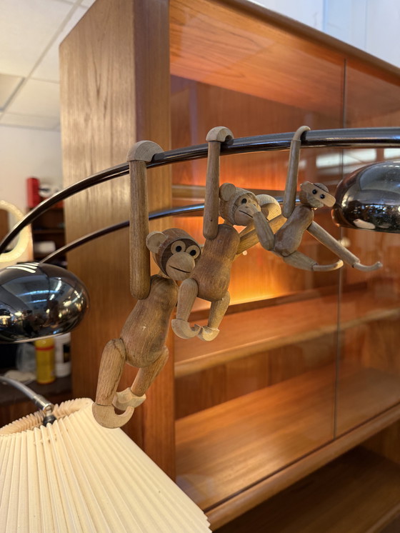 Uniek setje in 3-tal. Prachtig gedetailleerd vormgegeven. Het charmante houten aapje is ontworpen door Kay Bojesen en is het derde familielid van de aapenhorde tot nu toe. Het aapje is handgemaakt in Denemarken en gemaakt van teak en limba hout dat vele generaties meegaat. In nette maar gebruikte staat. Wordt verkocht als set.