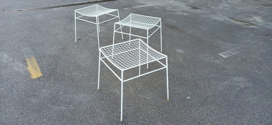 Set van 3 vintage witte draadkrukjes. Er zit een klein verfschilfertje op een van de krukjes (zie foto's) en bij een van de poten van een krukje ontbreekt de plastic voet (zie foto's).