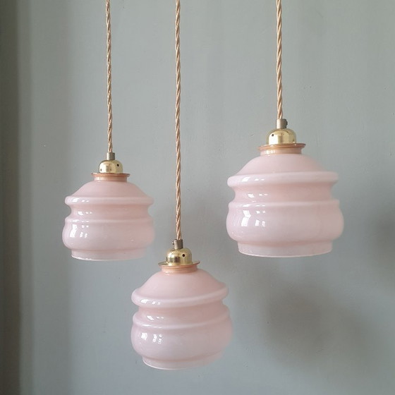 Set van 3 Vintage franse hanglampen - rose pastel opaline glas in Art Deco stijl in een leuke set van 3. Werkt goed als bijvoorbeeld eettafellamp of in de keuken boven een bar.