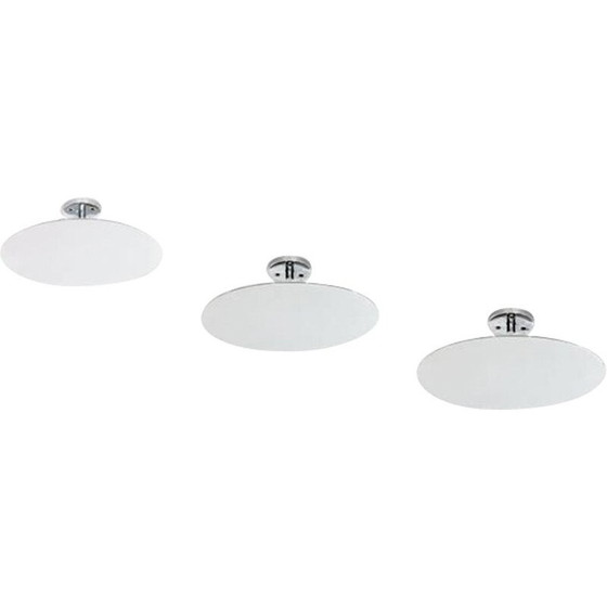 Suite van drie verchroomde, in metaal gevatte hanglampen van oplopende grootte, ronde plaat waaruit een korte tweelichts staf oprijst die een grote, lagere ronde schijf vasthoudt. Decoratieve kunst.Eugene Printz (1889-1948)