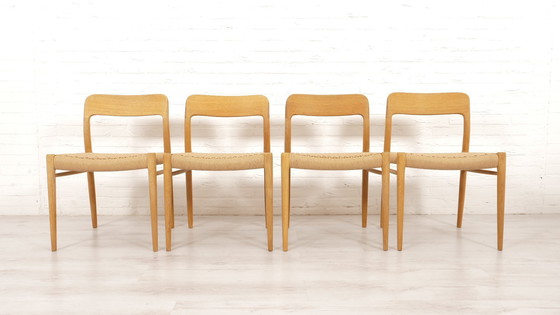 Artikelnummer: 211421 Set van 4 prachtige vintage eetkamerstoelen. Deze stoelen zijn ontworpen door Niels Otto Moller, model 75. De stoelen zijn uitgevoerd in eiken en voorzien van nieuw Deens Papercord. De frames van de stoelen zijn opnieuw gefinisht met Deense zeep. Ontwerp periode: 1950 - 1960 Stijl: Mid century modern - Deens design - Scandinavisch design - Japandi Materiaal: Eikenhout, Deens papercord Conditie: Gerestaureerd, frames nagekeken en voorzien van nieuw papercord Ontwerper: Niels Otto Moller Fabrikant: JL Mollers Mobelfabrik Afmetingen: Hoogte: 74 cm Zithoogte: 45 cm Breedte: 50 cm Diepte: 48 cm