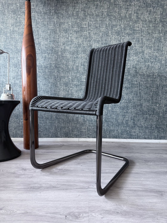 Slank, lichtgewicht en moeiteloos stijlvol - deze set van 4 authentieke Tecta D20 stoelen combineert een sculpturaal sledeframe van parelchroom met fijn geweven zwart wicker. Het glinsterende parelchroom geeft een zachtere, meer verfijnde gloed dan standaard staal en vormt een perfecte aanvulling op het diepe wicker met textuur.