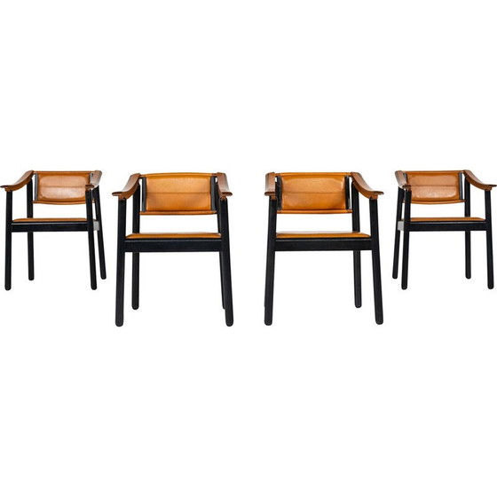 Set van 4 vintage fauteuils in hout en leer, Italië 1960