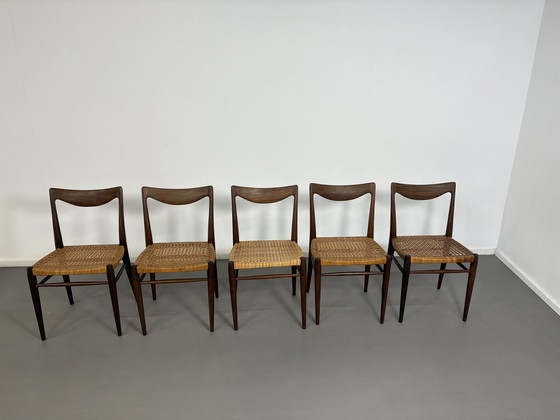 Set van 5 Deense palissanderhouten eetkamerstoelen met rotan uit 1960