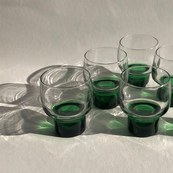 Set van 5 Kristallen Vintage Luminarc Likeurglaasjes met Massief Smaragdgroene Voet