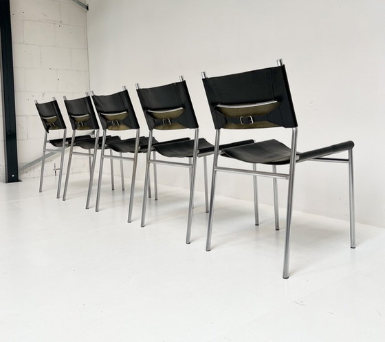 Geweldige set van 5 zwartlederen SE06 stoelen op een geborsteld en verchroomd metalen frame. Een ontwerp van Martin Visser voor het ’t Spectrum uit de 1960’s. Extra bijzonder aan de tuigleren bekleding zijn de gespen aan de achterzijde van de stoelen en de veters aan de onderzijde. De minimalistische stoelen doen sober aan, maar zitten geweldig. De stoelen hebben lichte gebruikerssporen conform leeftijd. Geen schade of vlekken in het leer. Een unieke set!