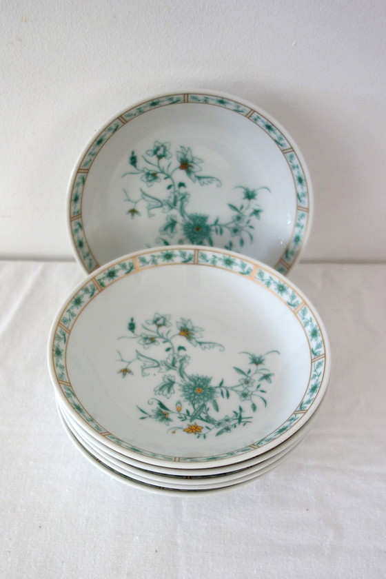 Set van 6 dessert- of broodkommen van Limoges porselein. Groen Peking-model van Bernardaud uit de jaren 70. Zeer mooie staat. Diameter: 13,5cm, Hoogte 2,8 cm.