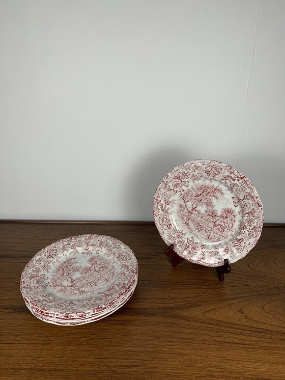 Set van 6 Engelse platte borden, rode tinten Afmeting: Diameter: 26cm Hoogte: 2,5cm Goede algemene staat, oude voorwerpen, behouden sporen van de tijd (fabricagefout aan de decoratie en 1 bord met een klein chipje aan de rand, zie foto's)
