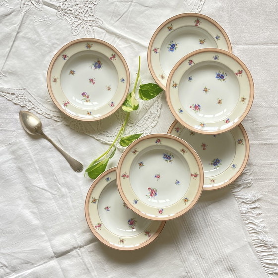 Set van 6 kleine soepborden Limoges Kleine bloemen en vergulding Antiek porselein Charles Ahrenfeldt