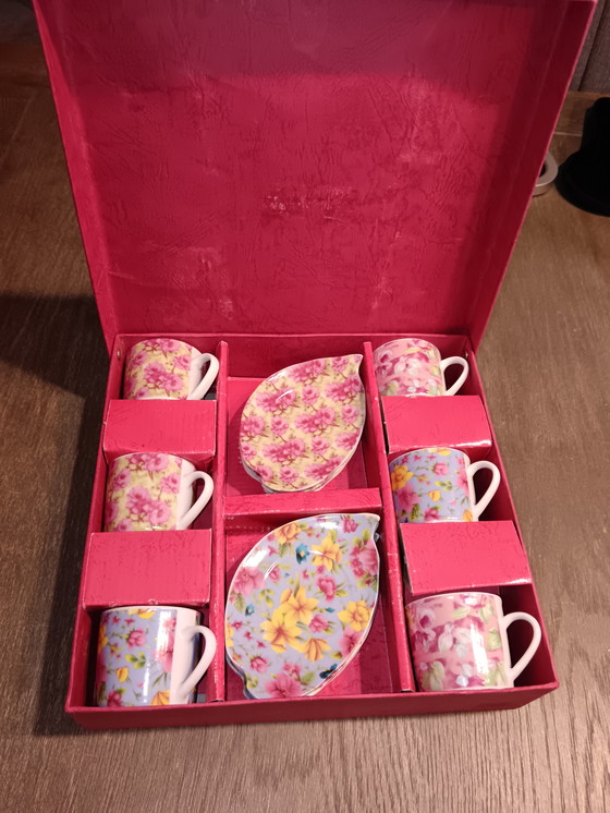 Ontdek de tijdloze elegantie van deze set van zes kopjes en schotels, perfect om uw serviescollectie aan te vullen. Elk kopje is vervaardigd van fijn porselein en versierd met een levendig bloemenmotief dat een vleugje kleur en verfijning aan uw tafel toevoegt.