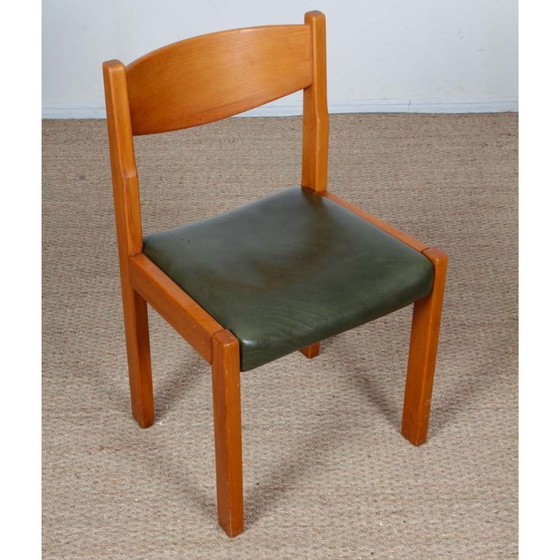 Deze set van zes massief iepenhouten stoelen is geproduceerd door Self. De zittingen zijn bekleed met groen leer. Deze stoelen zijn in goede vintage staat. Het leer vertoont enkele kleine imperfecties, zoals te zien op de foto's.
