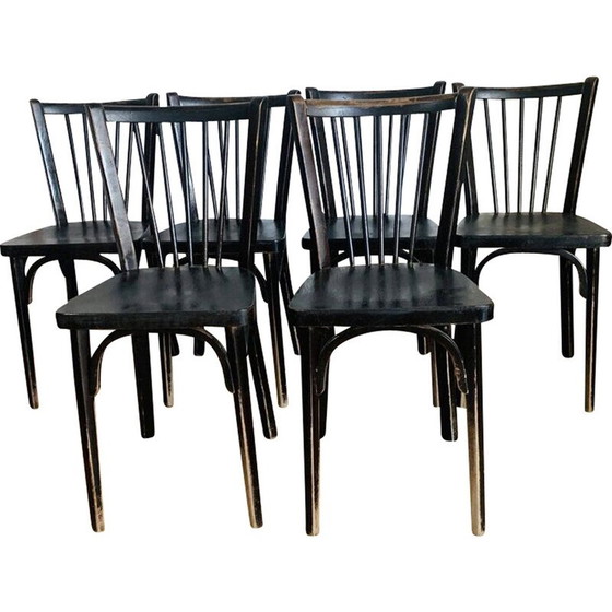 Set van 6 baumann stoelen model 153 - jaren 50-60 - gebogen houten stoelen - beuken frame - waaiervormige latten rugleuning - comfortabele, stevige en stabiele stoelen geschikt voor dagelijks gebruik - originele carbon zwarte vlek, prachtig patina door de tijd - enkele sporen van tijd en gebruik waaronder vlekken, krassen, verkleuringen, wrijven, stoten en andere vlekken - {hoogte: 81, 5cm - zithoogte: 47cm - breedte: 39, 5cm - zitbreedte: 37, 5cm - diepte: 45cm - zitdiepte: 37, 5cm} - mogelijke levering|contact.