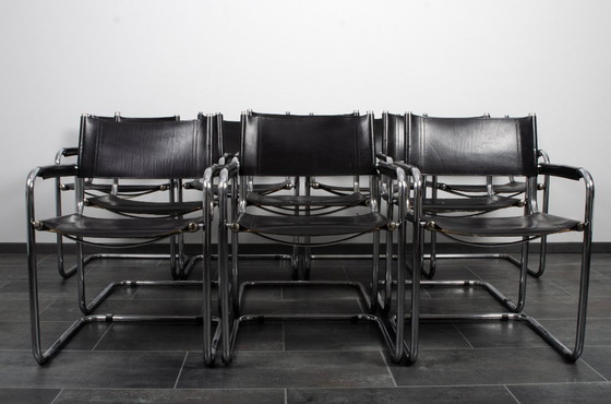 Prachtige set van 8 MG5 buisframe stoelen van Matteo Grassi. Zwaar verchroomd frame met dik zwart tuigleer bespannen. Dankzij de stelstangen kan de zitting evt nog wat strakker worden gespannen, mocht het leer na verloop van tijd wat oprekken. De stoelen zijn in uitmuntende staat, met lichte gebruikssporen (wat lichte krasjes/plekjes op de zittingen). De uitvoeringen van Matteo Grassi horen tot de top en deze stoelen zien er ondanks de leeftijd nog ongelofelijk goed uit. De prijs is per stoel, we hebben er momenteel 8 op voorraad (op de foto's staan er 10, maar we hebben er nog 8)