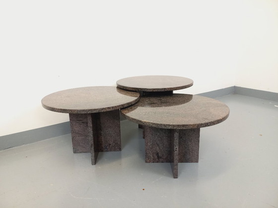 Set van drie vintage, in elkaar passende ronde salontafels van graniet uit de jaren 70 en 80.