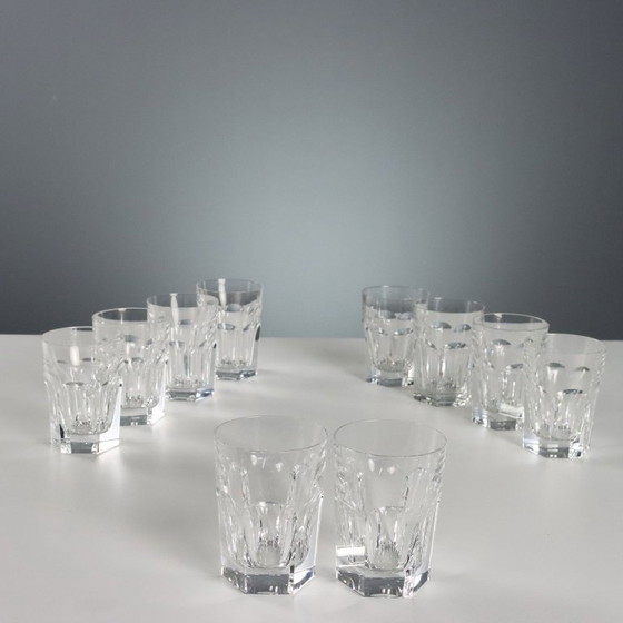 Set van tien Harcourt 1841 Baccarat glazen. Het fabrikantenmerk bevindt zich onder de voet. De Harcourt 1841 collectie, de oudste in het Baccarat archief, staat bekend om zijn iconische ontwerp.