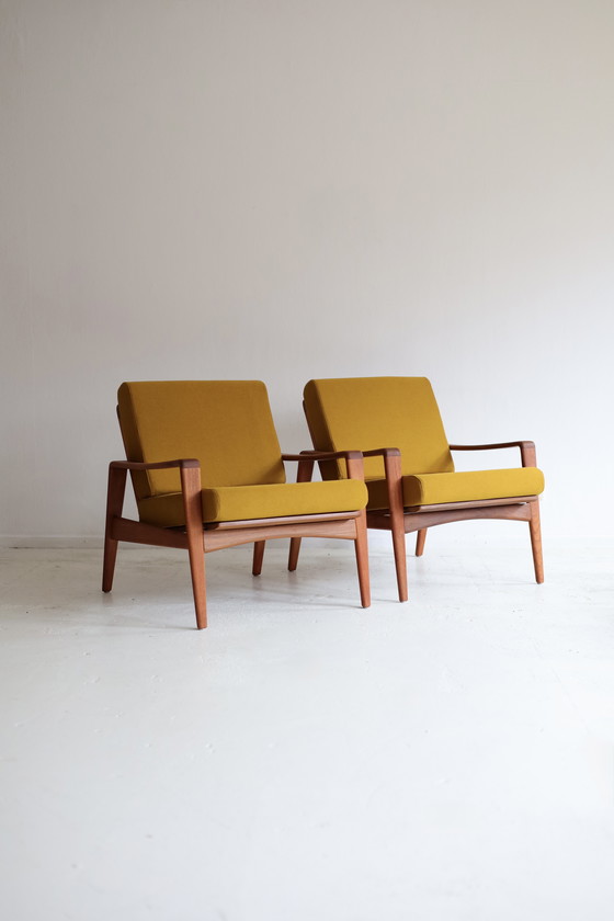 Deze fauteuils zijn ontworpen door Arne Wahl Iversen voor Komfort, en verkeren in uitstekende staat. Ze zijn hergestoffeerd in deze prachtige gele stof.