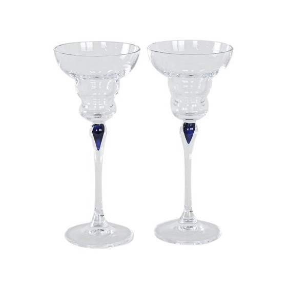 Glazen met een kobaltblauwe druppel, set van 2. Elegant, slank glas met een uniek detail in de vorm van een kobaltblauwe druppel in de steel, wat ze karakter en artistieke expressie geeft. Perfect om te verzamelen en om drankjes of desserts in een unieke stijl te serveren. Een uitstekend voorbeeld van handgemaakt glaswerk in vintage stijl.