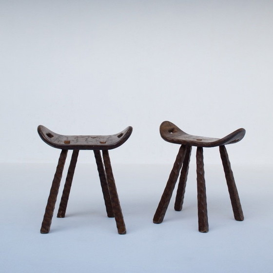 Dit expressieve paar houten krukjes met handgrepen toont een ruwe en sculpturale benadering van zitmeubelen. Elk krukje heeft een handgesneden zitting met geïntegreerde gripopeningen, rustend op vier facetvormige poten. De onregelmatige oppervlakken en zichtbare gereedschapssporen benadrukken het handgemaakte karakter van de stukken.