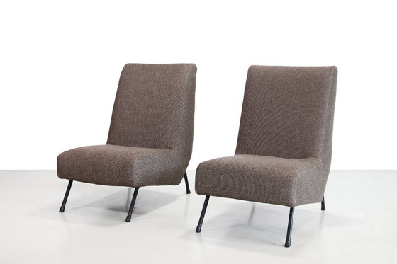Deze set van twee Italiaanse design fauteuils uit de jaren 50 straalt een tijdloze elegantie uit die perfect past in elk interieur. De fauteuils zijn bekleed met een rijke bruine stof die een warme en uitnodigende sfeer creëert. De slanke metalen poten geven de stoelen een moderne uitstraling, terwijl het ontwerp trouw blijft aan de iconische Mid Century Modern stijl.