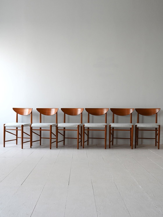 Met een frame van berkenhout, rugleuningen van teakhout en licht gestoffeerde zittingen zijn deze stoelen een perfecte mix van vorm en functie. Ze zijn gemaakt met Wegner's kenmerkende oog voor detail en tonen tijdloos Scandinavisch vakmanschap. AE1103