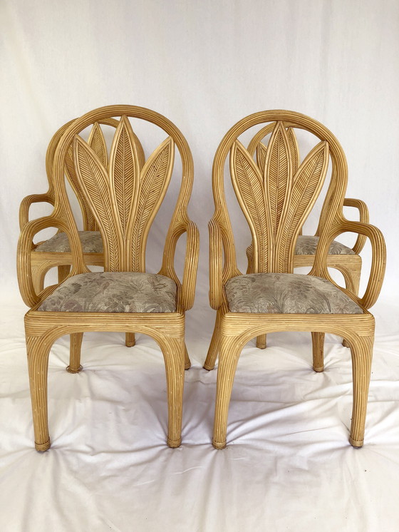 Een stijlvolle set van vier rotan eetkamerstoelen met bladdesign en papegaaienpatroon. Zeer comfortabel en functioneel. Goede staat met bij de leeftijd passende slijtage. Nieuwe bekleding aanbevolen.