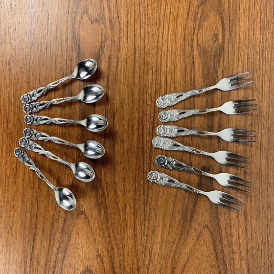 Set voor 6 personen Antiek zilveren metalen dessertlepels en vorken, bloemmotief