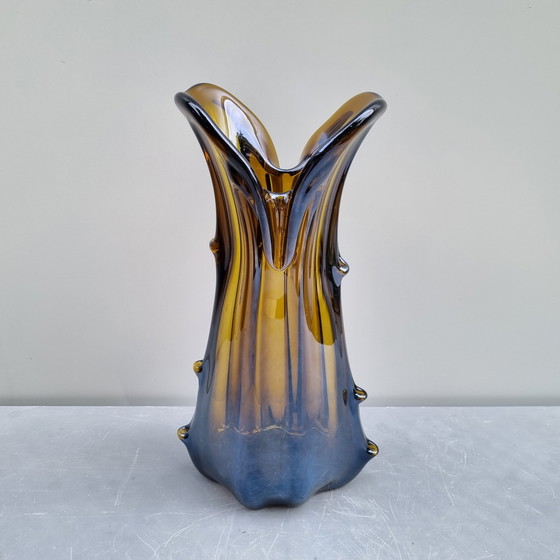 Een zeldzame, fantastisch vormgegeven amberkleurige vaas met iriserend metallic effect, gemaakt van Murano glas, circa 1970 in Italië.
