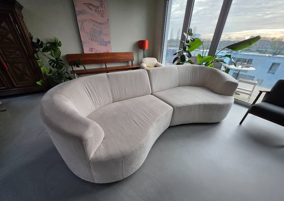 Een stijlvolle bank met een unieke vorm. Dankzij de afgeronde vormen nodigt deze bank uit om op te zitten en/of in een hoek te loungen. De warme ivoorkleurige Sorriso-stof past in elk interieur en versterkt het stijlvolle karakter van de bank.