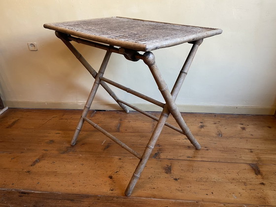 Super leuke en handige klaptafel uit Frankrijk. Hij is vrij stabiel. De onderkant van de tafel lijkt op bamboe maar is het niet, faux bamboe zoals dit heet. De bovenkant heeft een rieten matting die best nog in redelijke staat verkeert voor een tafeltje van begin 1900. Een tafeltje als deze kan ook heel leuk staan in een vintage interieur.