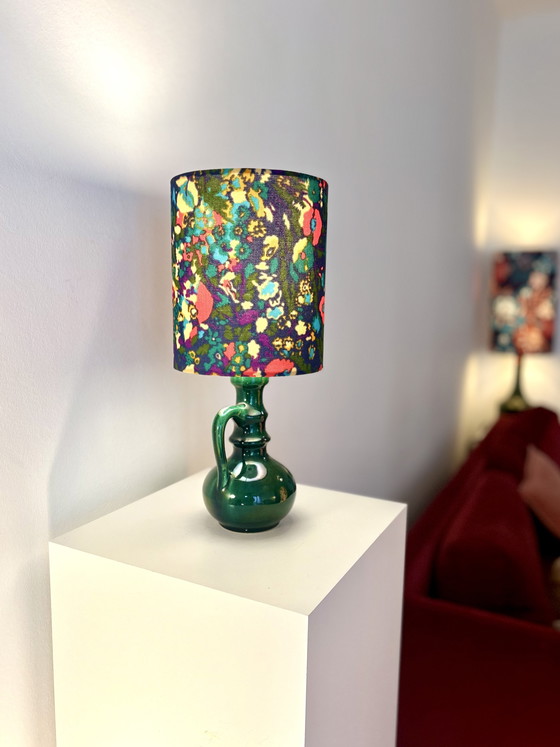 Lampenkap: De handgemaakte lampenkap van Roomlight Studio is bekleed met hoogwaardige meubelstof. Het expressieve, kleurrijke patroon zorgt voor een bijzonder warm en levendig lichteffect wanneer de lamp brandt – een opvallend contrast met de serene, diepgroene vaas.