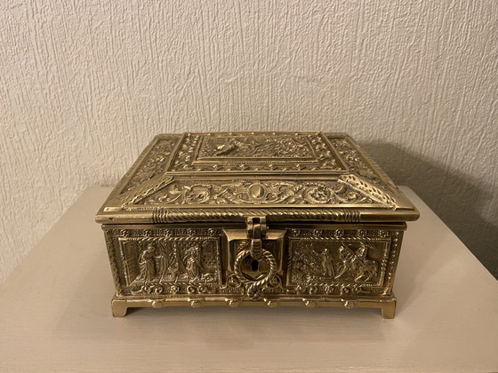 De doos is versierd met reliëfscènes met figuren en decoratieve motieven die typerend zijn voor de Renaissance, en gedetailleerd metaalwerk.
