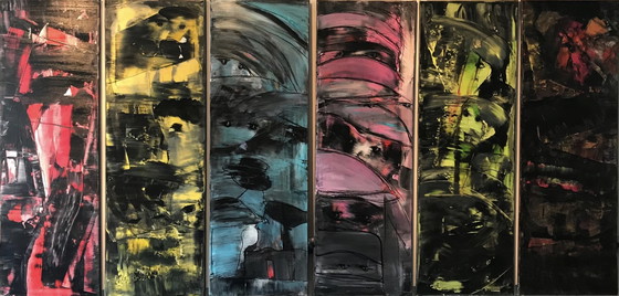 Six Pack is een schilderij van EllesBB, dat is vervaardigd in januari 2020. Het bestaat uit 6 canvas doeken van 40 x 120 cm. 2 groepen van 3 zijn aan elkaar verbonden (zie foto). die kunnen natuurlijk naar eigen smaak worden gerangschikt. Het zijn mixed media op canvas.