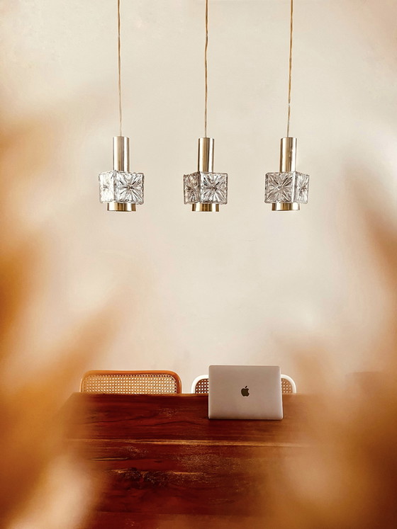 Wauw, wat een bijzonder item! Deze drie Ebersbach kristallen DDR hanglampen uit de jaren '60 zijn gemaakt van chroom met zijdevlaks prisma’s van kristalglas. Samen vormen ze een vierkant, waardoor de lampen samen met het chroom een hele chique look hebben. De lampen worden compleet geleverd met nieuwe fittingen, een ophangsnoer van 1,5 m en hangbalk.