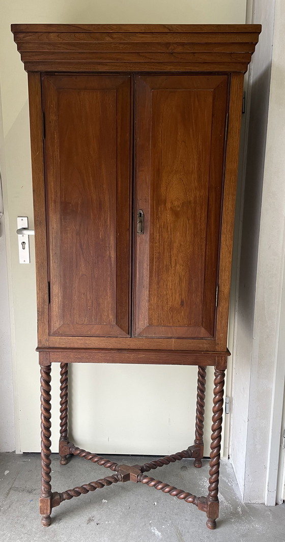 Bijzondere kast of hoog kabinet (vermoedelijk teak) met gedraaide kruispoot uit Nederlands Indië. Antiek. Gemerkt met etiket van de maker, Weng an Djiong. Het bovendeel kan los van de poot, het bovendeel is 1 mtr hoog.