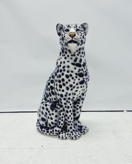 Uniek handgemaakt beeld van een sneeuwluipaard. Dit Hollywood Regency beeld, vervaardigd van met de hand beschilderd keramiek en gemaakt in Italië, zal ongetwijfeld een verbluffende en stoere uitstraling aan je interieur toevoegen!