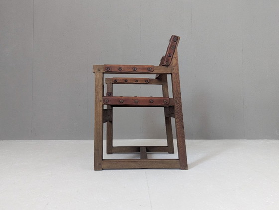 Deze fauteuil is een opvallend voorbeeld van het Spaanse brutalisme uit de Mid Century en werd in de jaren 1950 geproduceerd door Biosca in Spanje. Het stuk is gemaakt van massief grenen en dik tuigleer en combineert rustieke kracht met tijdloze ambachtelijke details. De robuuste geometrie van de stoel weerspiegelt Biosca's kenmerkende vakmanschap en roept de tactiele erfenis op van 18e-eeuws Spaans design.