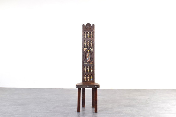 Deze Spaanse stoel van Ormecasa uit de jaren 70 is een voorbeeld van een solide, functioneel ontwerp dat een eenvoudige vorm combineert met traditioneel timmermansvakmanschap. De rugleuning is versierd met een afbeelding van Jezus en de twaalf apostelen. De stoel kan dienen als zowel een functioneel meubelstuk als een stijlvol accent met een hoge artistieke en historische waarde.
