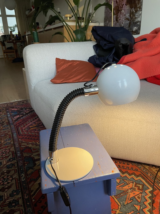 Beleef de coole jaren 70 opnieuw met deze iconische Space Age-oogbollamp van Reggiani. Perfect om een vleugje retro-futuristische flair aan je interieur toe te voegen. Deze lamp is een echte blikvanger. De strakke witte bol en flexibele zwarte hals maken het niet zomaar een lamp, maar een kunstwerk.
