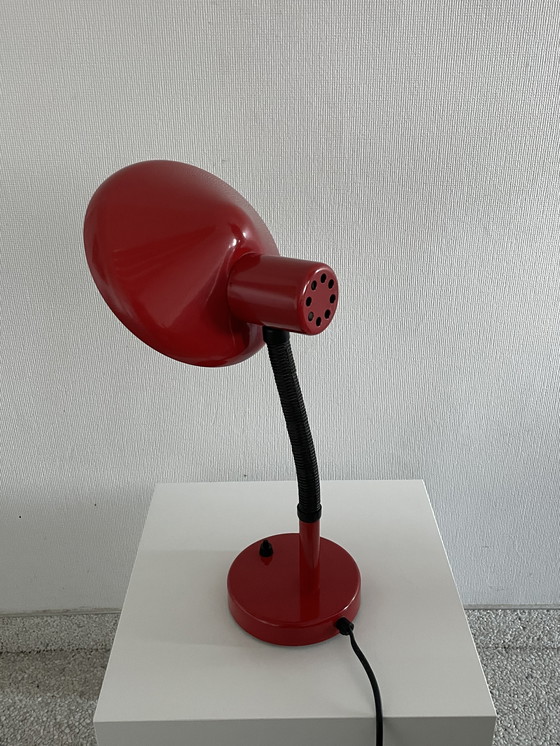 Deze mooie Space Age lamp in de typische rode kleur is ontworpen in de jaren ‘60-‘70. De kap en voet zijn in metaal en de arm is in een plooibaar zwart rubber.