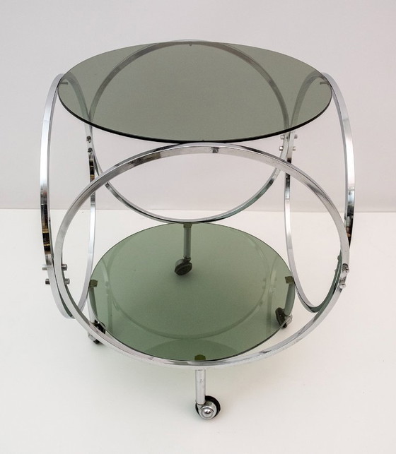 Space Age vintage salontafel van verchroomd metaal en rookglas uit de jaren 70.