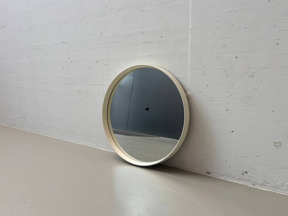Ronde wandspiegel in de strakke, minimalistische Space Age-stijl van de jaren 70, met een ontwerp dat typerend is voor die tijd. Het brede, crèmekleurige kunststof frame geeft de spiegel een zachte, bijna sculpturale uitstraling en contrasteert prachtig met het heldere, reflecterende oppervlak. Op de achterkant bevindt zich het originele Möbel Mann-label, wat duidt op distributie in Duitstalige landen. Het ontwerp en de materialen zijn typisch voor Italiaanse massaproductiemeubelen uit deze periode. De eenvoudige vorm maakt de spiegel veelzijdig – geschikt voor de hal, badkamer of als subtiel designelement in de woonkamer.