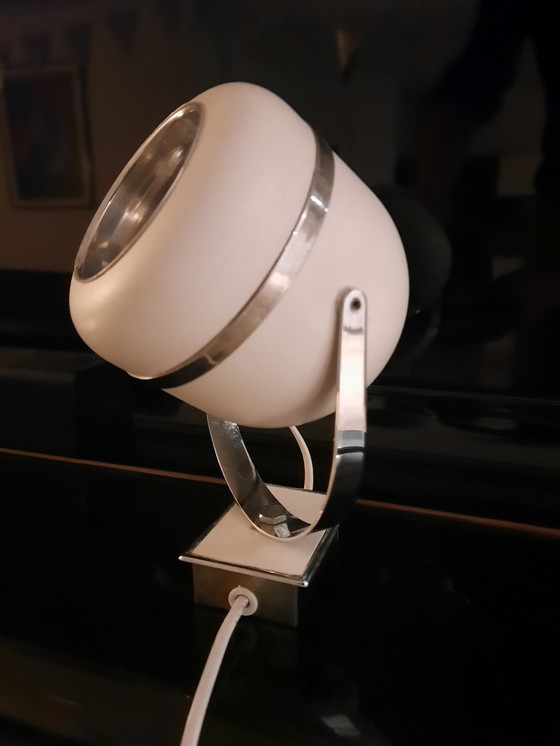 Witte Space Age eyeball lamp op zware metalen voet. Het lichtpunt is verstelbaar. Prachtig Italiaanse design lamp Model: Eyeball Herkomst: Italy Periode: 1960-1969 Stijl: Space Age Materiaal: Aluminum, metaal, chroom Kleur: wit, zilver Afmeting: Hoogte: 27 cm Breedte: 13 cm Diepte: 14 cm