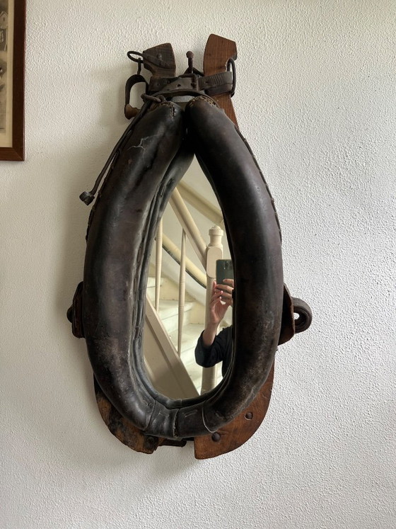 This unique mirror, crafted from an original horse halter, brings a touch of rustic charm to any space. Its distinctive design, featuring authentic leather and wood, makes it a conversation piece that reflects both history and style.