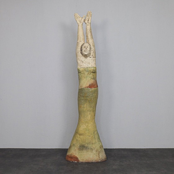Een krachtige en langgerekte keramische sculptuur van de Nederlandse kunstenaar Sjer Jacobs, gemaakt in de jaren 90. De figuur staat rechtop met opgeheven armen, wat een sterke verticale compositie vormt die zowel ritueel als verstilling oproept.