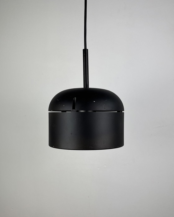 Black vintage pendant lamp, model 5518, designed by Arnold Berges for Staff Leuchten in Germany during the 1970s. This elegant piece combines a sleek industrial aesthetic with the playful geometry of the Space Age era, making it a striking focal point for any modern or vintage-inspired interior.