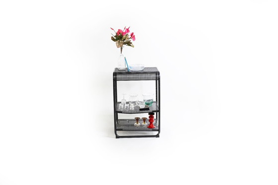 Deze stijlvolle staande plank in de Bauhaus-stijl van de jaren 1970 maakt indruk met zijn minimalistische designtaal en industriële elegantie. De open rasterstructuur van gepoedercoat staal geeft de plank zowel lichtheid als stabiliteit. Als boekenplank, plantenstandaard of presentatieoppervlak - dit meubel is veelzijdig en brengt tijdloos design in elke kamer.