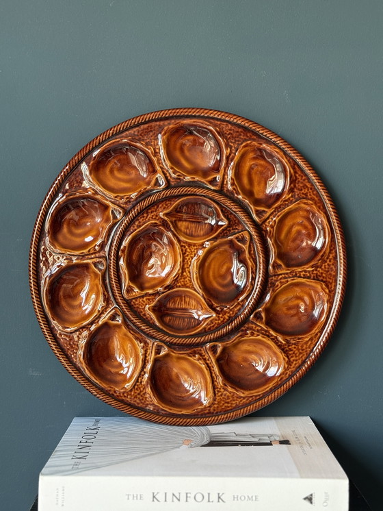 Grote bruine XL oesterschaal in Majolica stijl. Voor 12 oesters en citroenpartjes. Geproduceerd in de ‘70 in Frankrijk. Niet alleen geweldig voor oesters, maar ook voor andere kleine (vis) hapjes of als een prachtig decoratief (wand) object in de keuken. De borden bied ik apart aan.