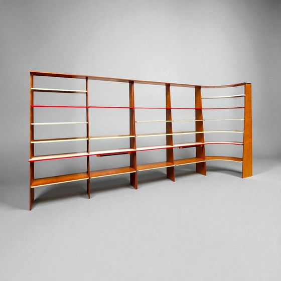 De achterpanelen zijn verwijderd, waardoor het meubelstuk een open, modern karakter krijgt en ideaal is als woonkamer- of bibliotheekplank. De gebogen rechterkant is bijzonder opvallend en geeft de plank een organische lichtheid en transformeert hem in een sculpturaal object.